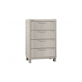 Cajonero con gran capacidad de almacenamiento. Tiene 4 cajones grandes con sistema de fácil apertura gracias al diseño del sistema de rodamiento integrado sin piezas metálicas. Manijas ergonómica y no requiere ensamble. Muy decorativo por su apariencia rattán.