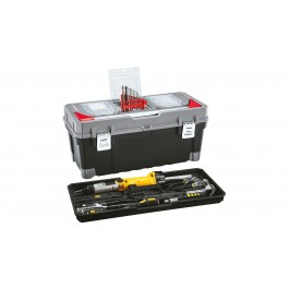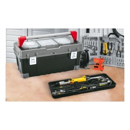 Caja de herramienta PROFESIONAL con cerradura metálica. Resistente y funcional. Sirve para almacenar cualquier tipo de herramienta para realizar trabajos pesados. Se pueden guardar martillos, llaves, alicates, destornilladores, pinzas, juego de dados, copas, segueta, taladros, pulidora, entre otros. Adicionalmente, cuenta con prácticos compartimientos que nos permiten clasificar e identificar rápidamente aquellos elementos de tamaños pequeños, además de que evitamos que se nos pierdan con facilidad. Los tacones que tiene en sus esquinas la protegen del trabajo pesado que realizan los profesionales. Su manija de aluminio la hace confortable y segura en el momento de cargarla. Resiste hasta 50 kg