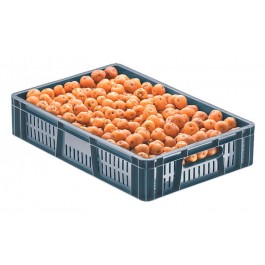 Canastilla industrial de fondo lineal y paredes en rombo. Tiene manijas laterales para facilitar su uso. Ideal para operaciones de almacenamiento y transporte de alimentos y otros elementos.