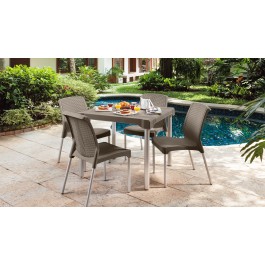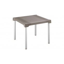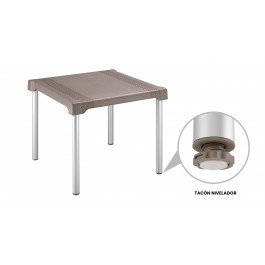 Mesa SHIA apariencia Rattan, con tejido perforado que imita el tejido artesanal. Exclusiva mezcla de materiales con patas en aluminio que no se oxidan. Cuenta con un tacón nivelador. La mesa es cuadrada con una medida de 85 x 85 cm. Tiene un tapón de centro especial para parasol. Fácil de armar, no requiere herramientas. Fácil de limpiar.